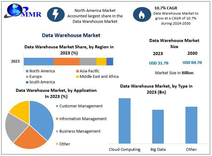 Data Warehouse Market size was valued at USD 31.79 Bn. in 2023 and the total revenue is expected to grow at a CAGR of 10.7% through 2023 to 2030, reaching nearly USD 64.76 Bn.